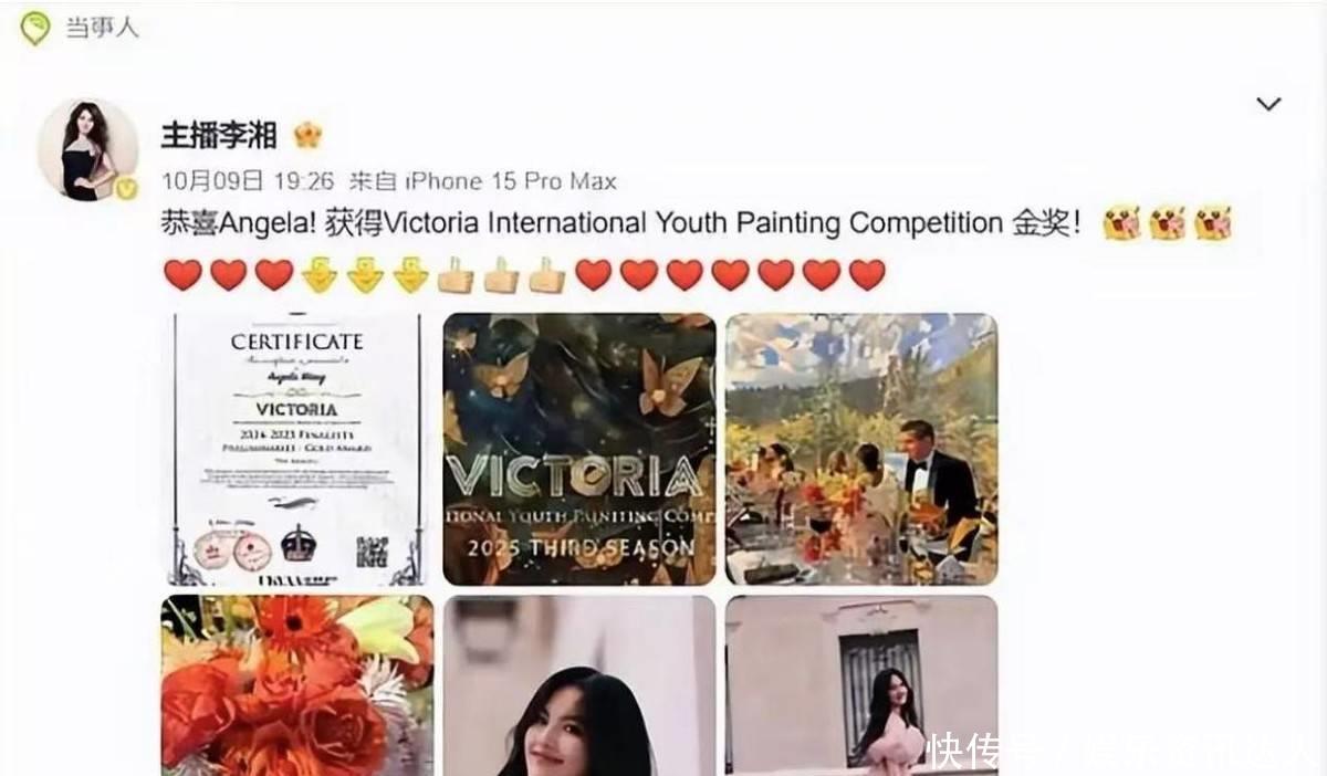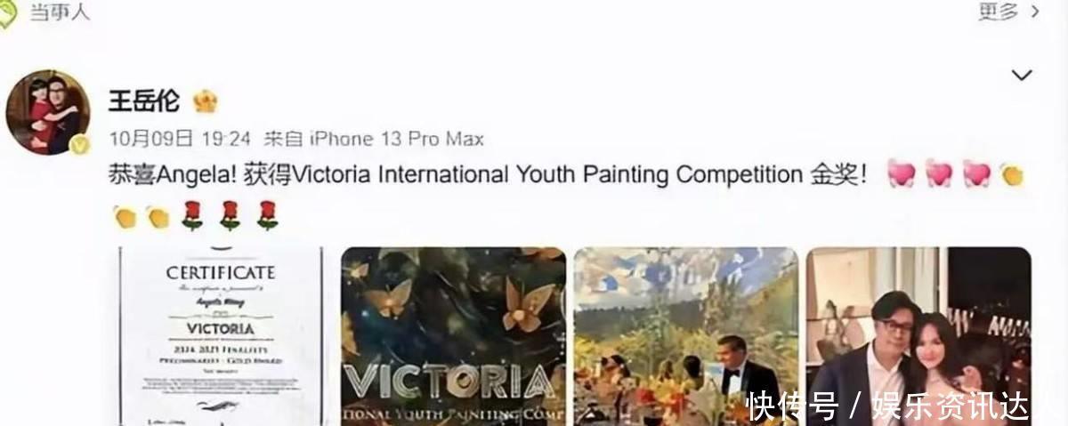 答案显而易见——这一次,两位家长都在为女儿庆祝她的荣誉。10日,李湘和王岳伦分别在自己的微博上发布了王诗龄获奖的消息,而且发布的时间相差只有两分钟,几乎可以说是同步发声。而这个奖项不仅仅是国内的荣誉,而是来自国际的认可——王诗龄在维多利亚青少年绘画比赛中荣获金奖。
